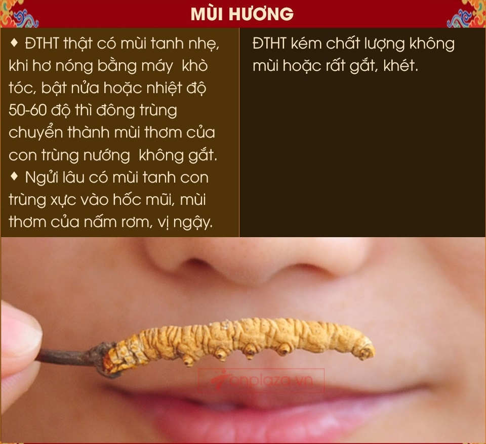 - Đông trùng hạ thảo giả thường không có mùi tanh này, nếu có thì do làm giả nên thường có mùi tanh như cá, mùi nước hoa hay nguyên liệu hóa học.
