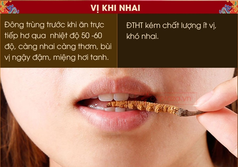 - Đông trùng hạ thảo Tây Tạng chính hãng khi cho vào miệng nhai vụn như ăn hạt đậu nành, hạt tấm càng nhai càng thơm như thịt gà.